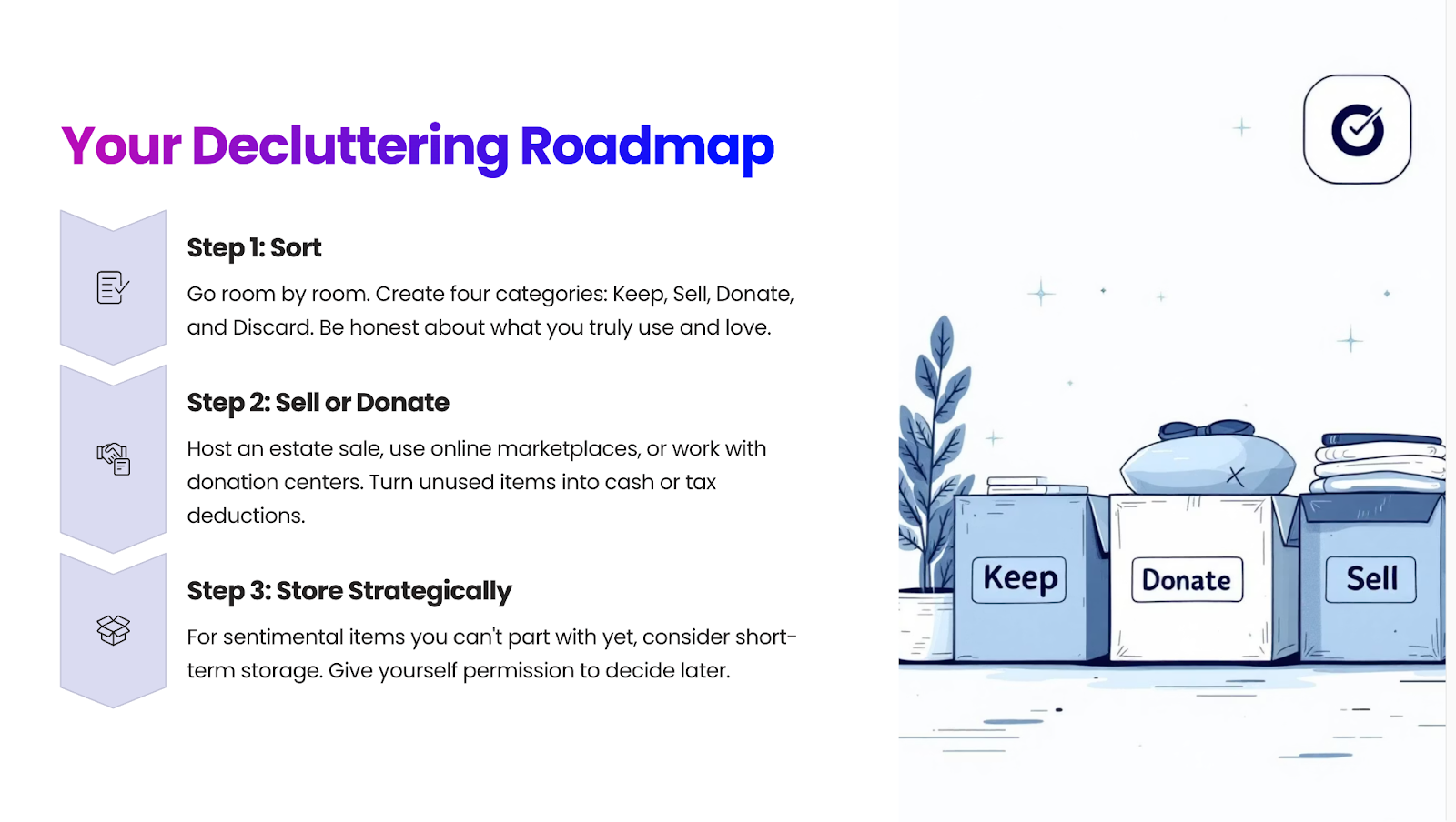 Decluttering Roadmap: Provide a simple, actionable 3-step process (e.g., "Sort, Sell/Donate, Store").